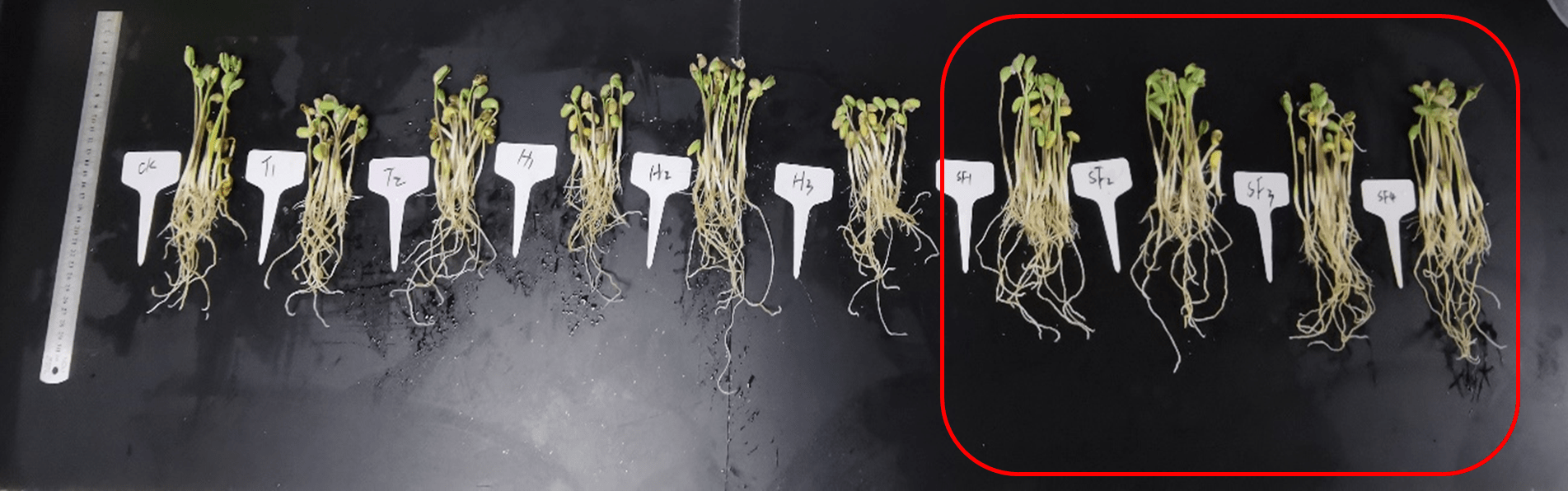 (2)測(cè)試了在低溫與高溫條件下,花粉多糖對(duì)大豆幼苗生長的影響。對(duì)比其他生物刺激素,花粉多糖在高低溫逆境條件下,可顯著促進(jìn)大豆根長、莖粗及鮮重增加,其中高溫條件下大豆根長根重分別增加了20.45%、55.58%,顯著優(yōu)于其它生物刺激素效果。