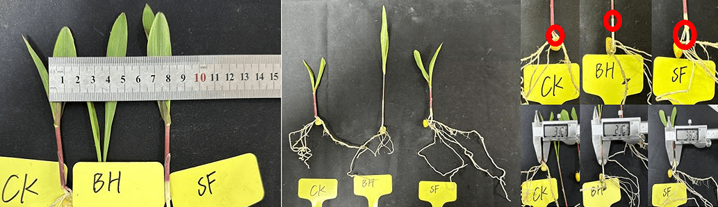(1)針對(duì)玉米作物:在14℃~22℃培養(yǎng)條件下,對(duì)比其他種子處理劑,采用50g/100kg花粉多糖進(jìn)行玉米拌種處理,試驗(yàn)27天后發(fā)現(xiàn),花粉多糖處理后玉米株高生長雖弱于其他種子處理劑,但莖粗、根鮮重、氣生根長出率及氣生根根長均顯著優(yōu)于,其中明顯看出其他種子處理劑處理后,玉米未生長出氣生根。說明花粉多糖拌種玉米,可明顯增加玉米氣生根生長,提升玉米后期抗倒伏能力。