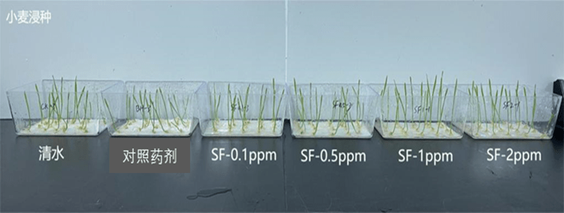 (2)針對(duì)小麥作物:浸種處理后發(fā)現(xiàn),試驗(yàn)范圍內(nèi)的花粉多糖對(duì)小麥株高、根長、株重、根重均具有促進(jìn)作用,其中在2 ppm處理下,相比陽性對(duì)照處理,花粉多糖處理后小麥株高、根長、株重及根重分別增長12%、24%、45%、43%。