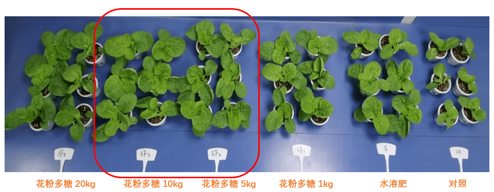 (1)花粉多糖復(fù)配水溶肥提效增產(chǎn)。在水溶肥中添加5-10kg/t花粉多糖,可促進(jìn)小白菜光合作用,顯著提高葉綠素含量10.97%,促進(jìn)小白菜葉片生長,地上部生物量增加34.0%-41.78%;同時(shí),水溶肥復(fù)配花粉多糖,能提高小白菜的營養(yǎng)品質(zhì),促進(jìn)葉片Vc含量及可溶性糖含量積累。