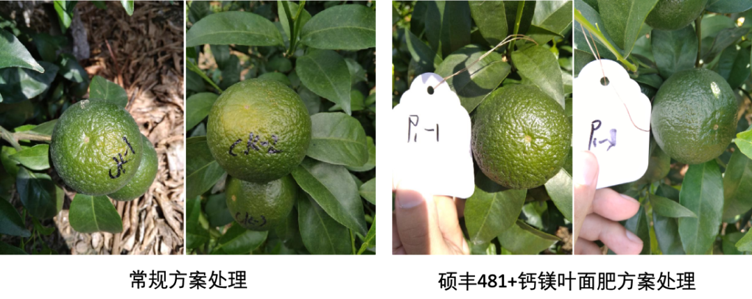 在雜柑的幼果膨大期使用天然蕓苔素+鈣鎂葉面肥能夠促進樹體補充鈣元素,果面光靚,減少裂果產生,預防日灼果。小編推薦:雜柑幼果膨大期,使用天然蕓苔素碩豐481?2000倍+多迎鈣鎂1000倍噴霧。與常規方案處理相比,此方案處理,果實直徑大、果面光亮,日灼果發生概率降低30%。